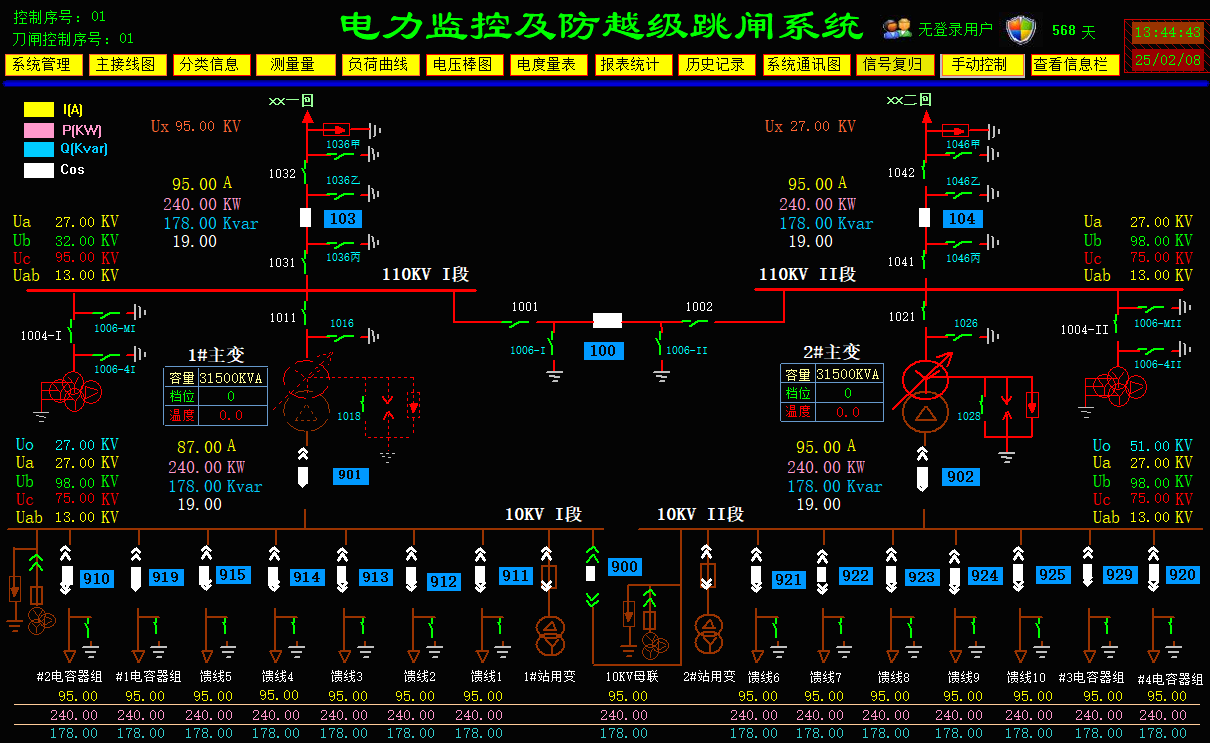 显示功能:以表格、曲线(可以查询电压、电流等历史曲线,并储存1年以上)、直方图、动画模拟图、声光报警形式显示电力系统的实时数据、历史数据、运行状态、报警状态。
