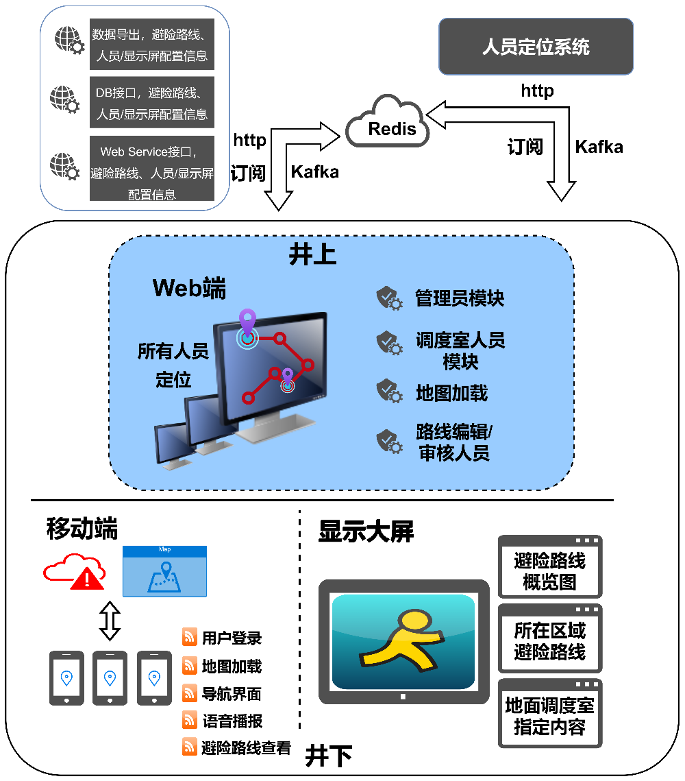 基于大数据与Ai驱动的矿井人员定位及应急避险系统是建立在井下网络通信的基础上,利用人员定位与移动导航技术开发的一套在井下保障矿工安全的应急装备。当井下发生安全事故时,系统可在第一时间向手持移动终端的井下人员推送避险逃生路线,同时通过在井下巷道中安装的隔爆本安型显示器同步显示相应区域的避险逃生路线,提高井下人员的自救能力,减少井下事故造成的不必要人员伤亡,保障井下工作人员的生命安全。