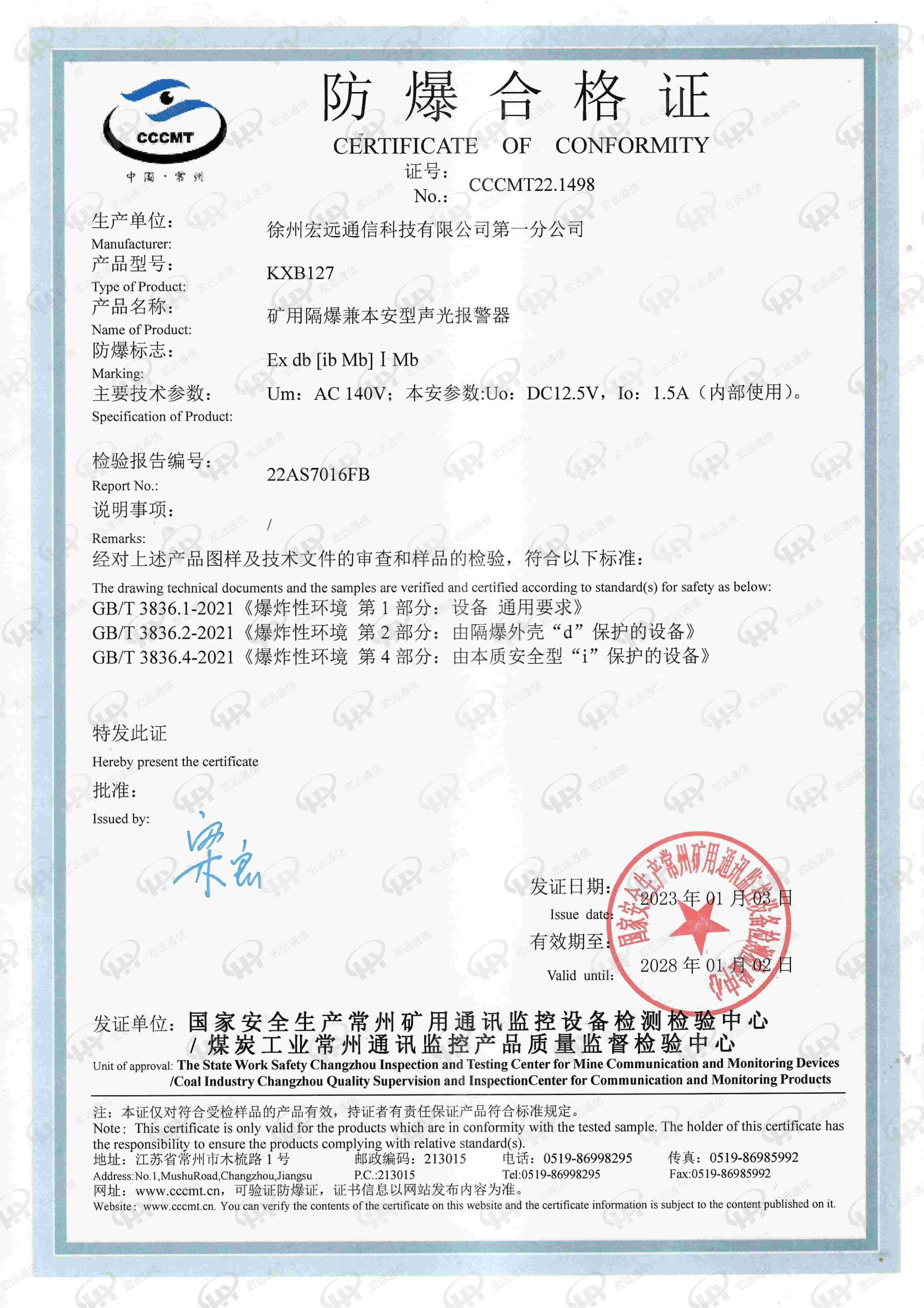 矿用隔爆兼本安型声光报警器KXB127防爆证