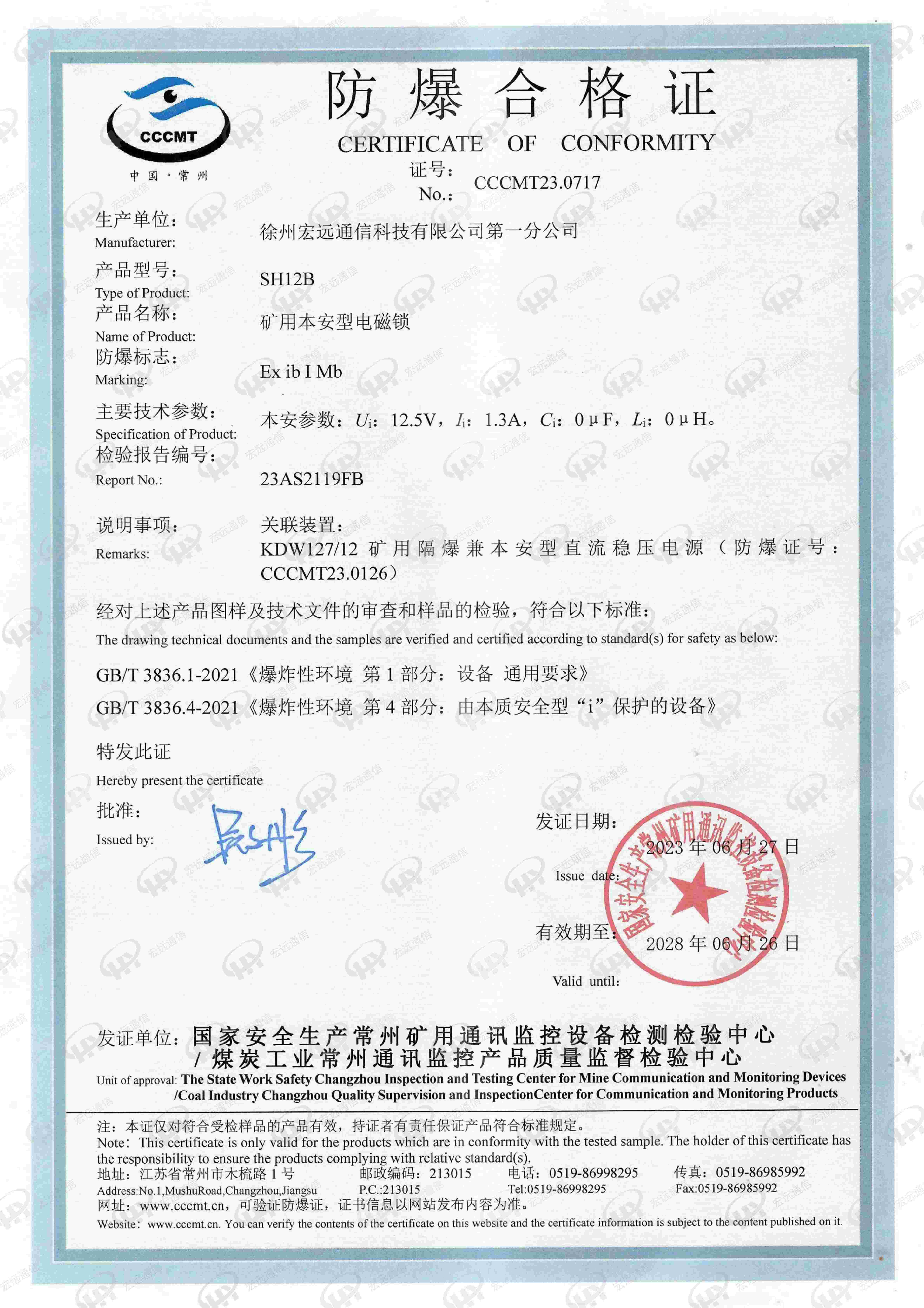 矿用本安型电磁锁SH12B 防爆证