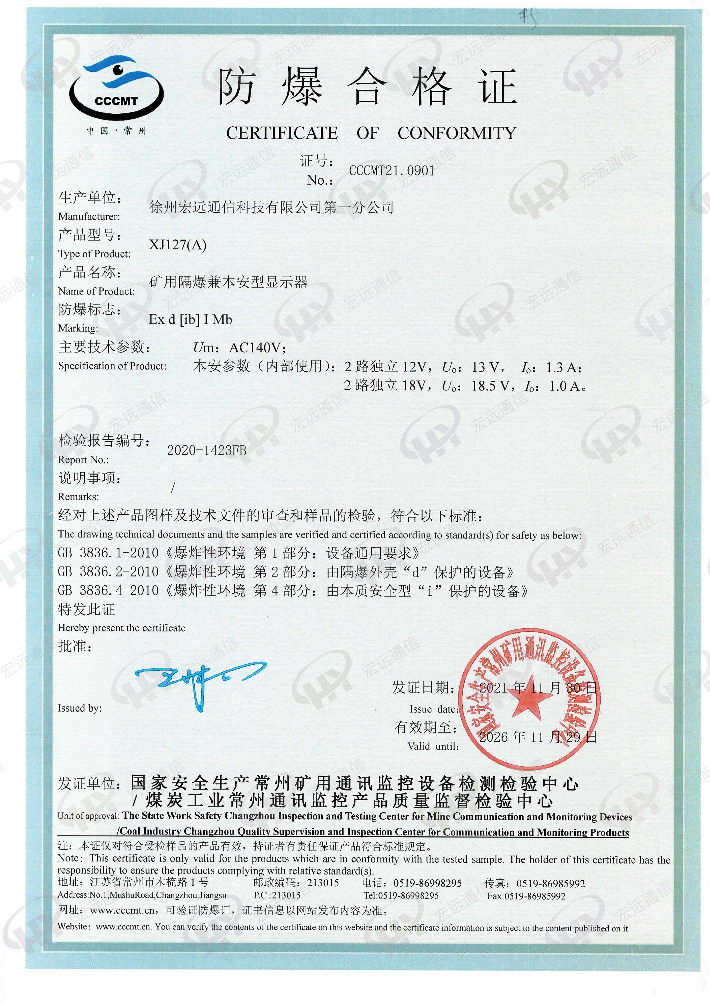 矿用隔爆兼本安型显示器XJ127(A)防爆证