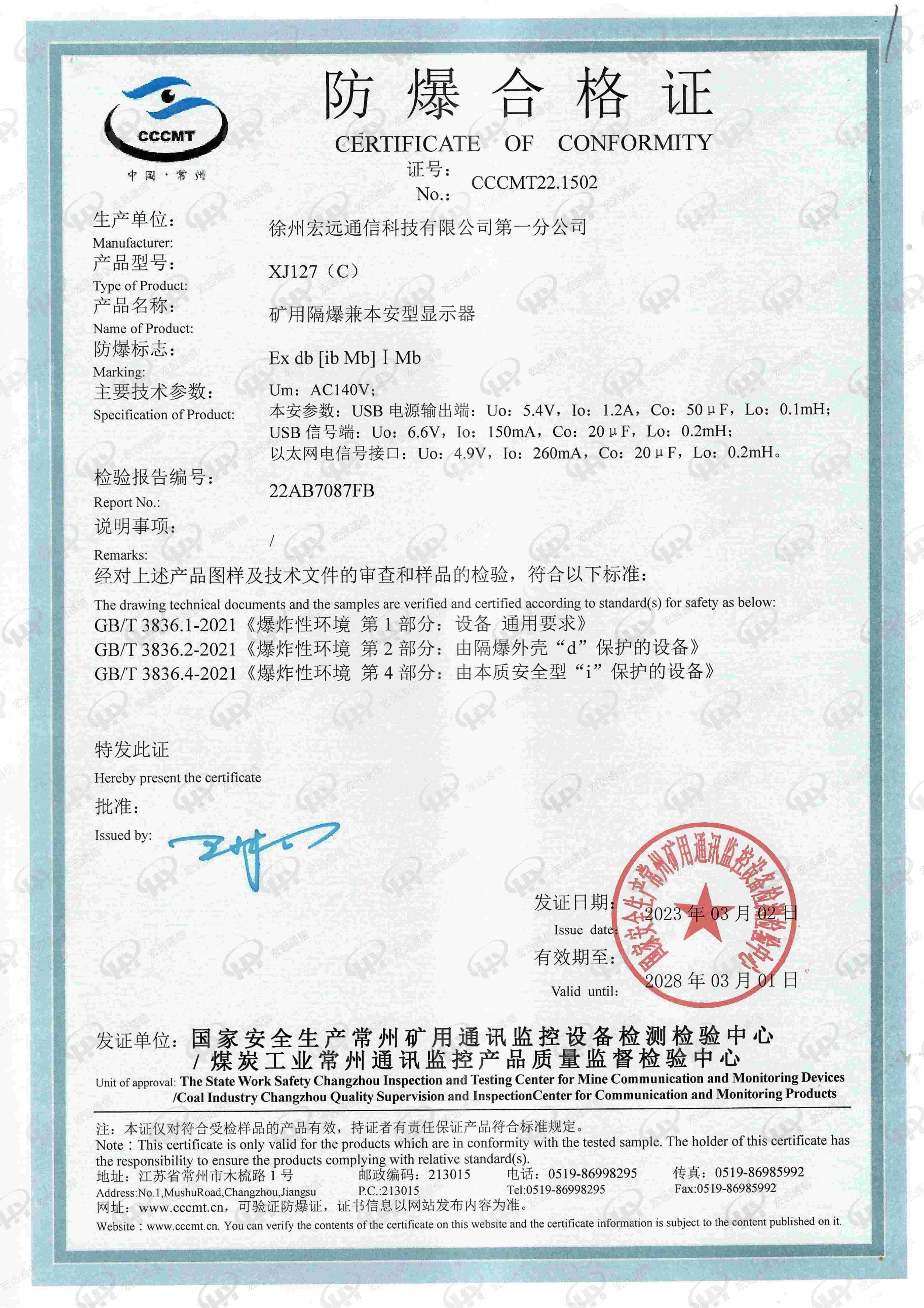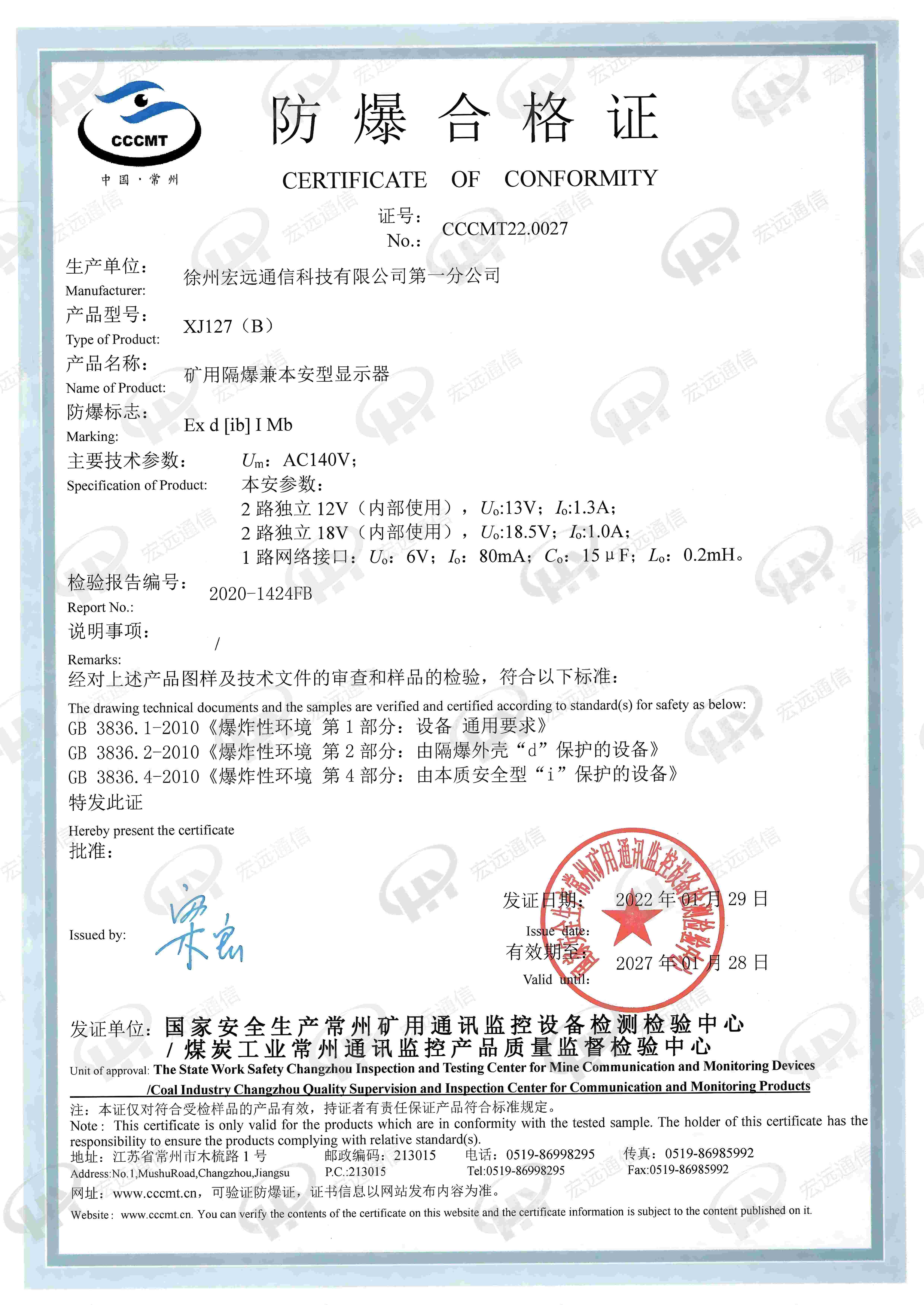 矿用隔爆兼本安型显示器XJ127(C)防爆证