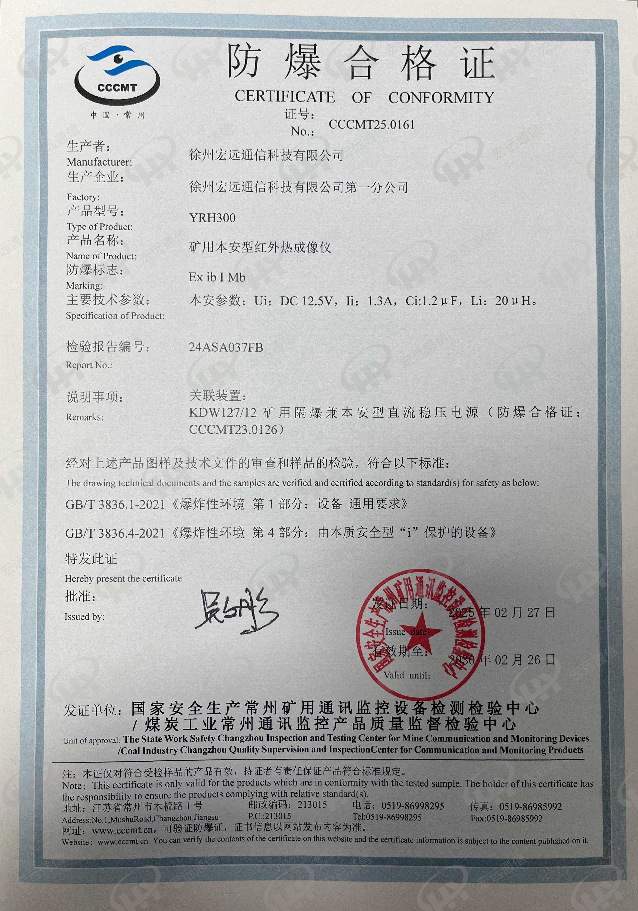 矿用本安型红外热成像仪YRH300 防爆证